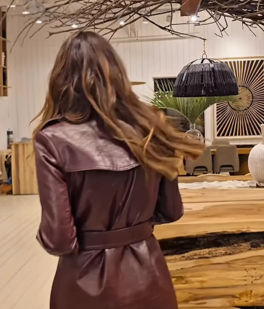 El diseño elegido por Carolina Pampita Ardohain se aleja de las camperas tradicionales para acercarse a una versión más elegante y estructurada. Se trata de un abrigo tipo trench de cuero, con corte entallado y cinturón a la cintura, que estiliza la silueta y aporta una impronta sofisticada.